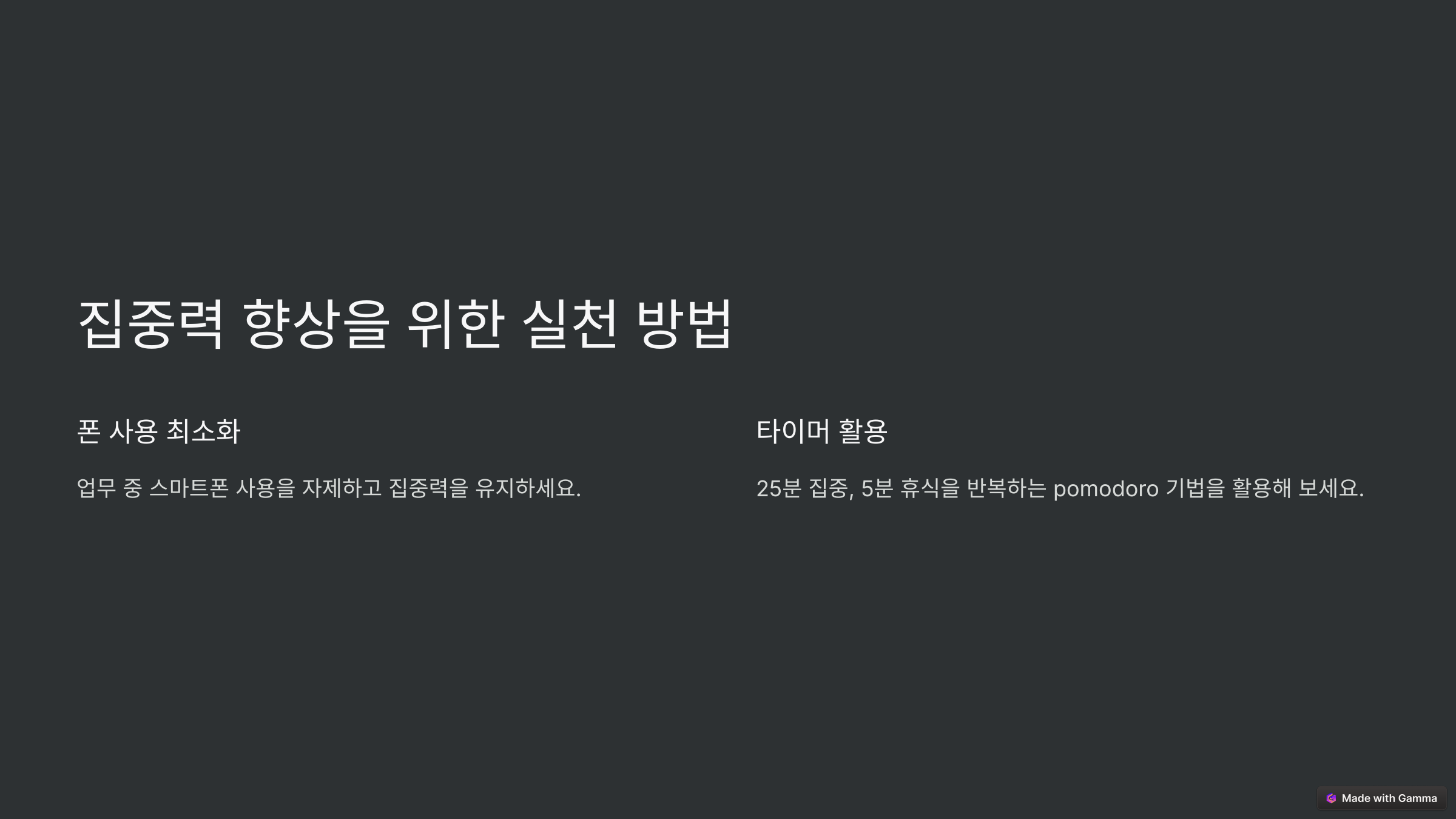 - 디지털 디톡스: 자기계발 시간 동안 스마트폰 알림을 끄고, 방해 요소를 최소화하세요.
